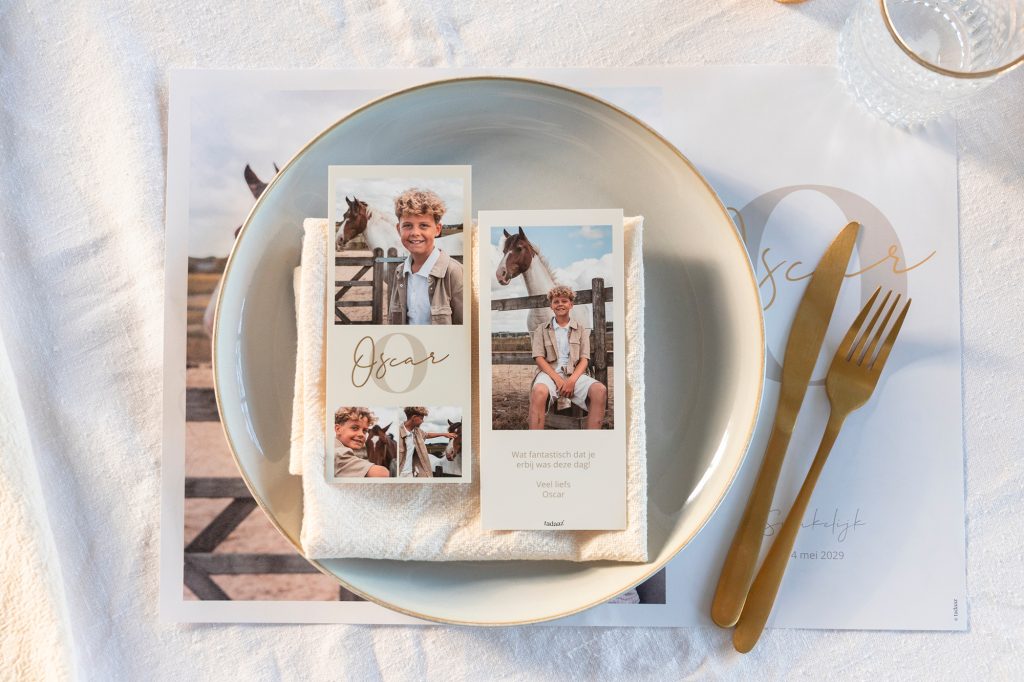 Het verschil tussen een communiefeest en een lentefeest zit ‘m niet alleen in de ceremonie, maar ook in heel wat kleine dingen. In beide gevallen staat het feestvarken gewoonlijk heel leuk te stralen op de foto’s voor de uitnodigingen en de bedankjes, maar in het geval van een communie worden er soms ook christelijke symbolen zoals een wijnkelk of kruisje op de kaartjes gedrukt. Alle gasten zullen erg blij zijn met deze prachtige kaartjes met jouw leuke foto! Ook tijdens het feest kunnen deze christelijke elementen terug komen.