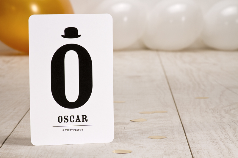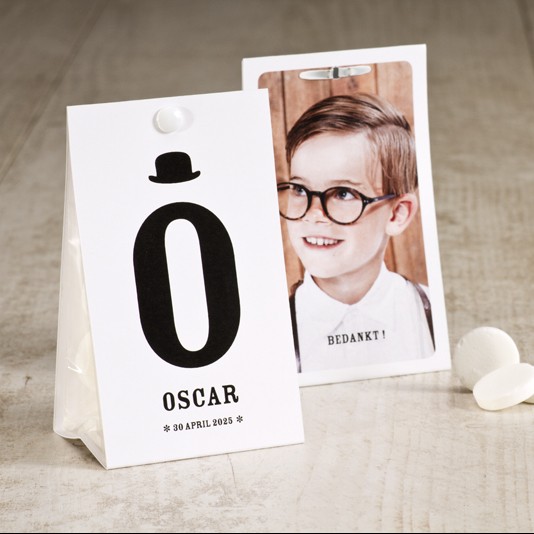 Wil je liever een uitnodiging zonder foto? Dan is het kaartje met initiaal en een leuk bolhoedje een superleuk idee.