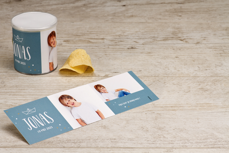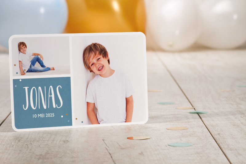 Een originele uitnodiging met een vrolijk kleurtje en een guitige foto… daar smelt toch iedereen voor! Kies voor een fotokaart met kleurvlakje en speel met de motiefjes en fotovelden voor een 100% eigen kaartje.