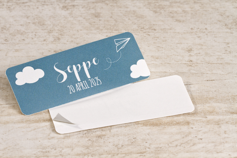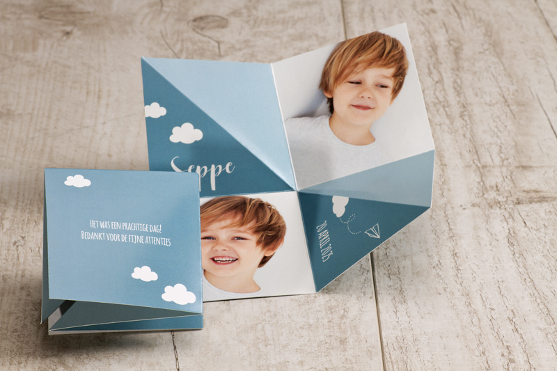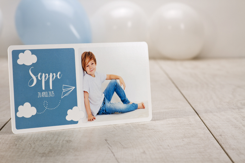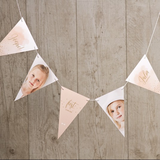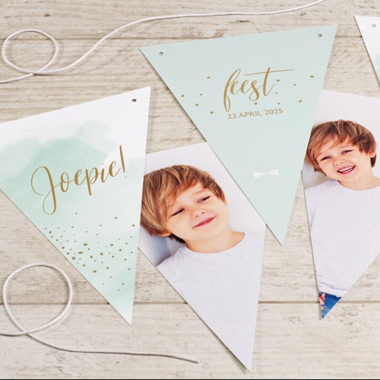 De leuke elementen van je uitnodiging trek je ook door in het feest. Je kan placemats, servetringen, vlaggenlijntjes en bedankjes personaliseren met eigen foto’s en dezelfde dromerige motiefjes op je kaart.