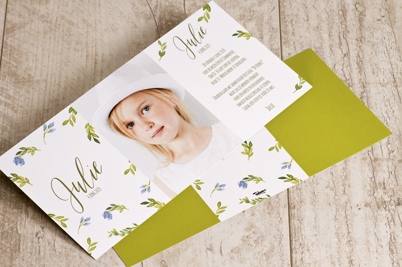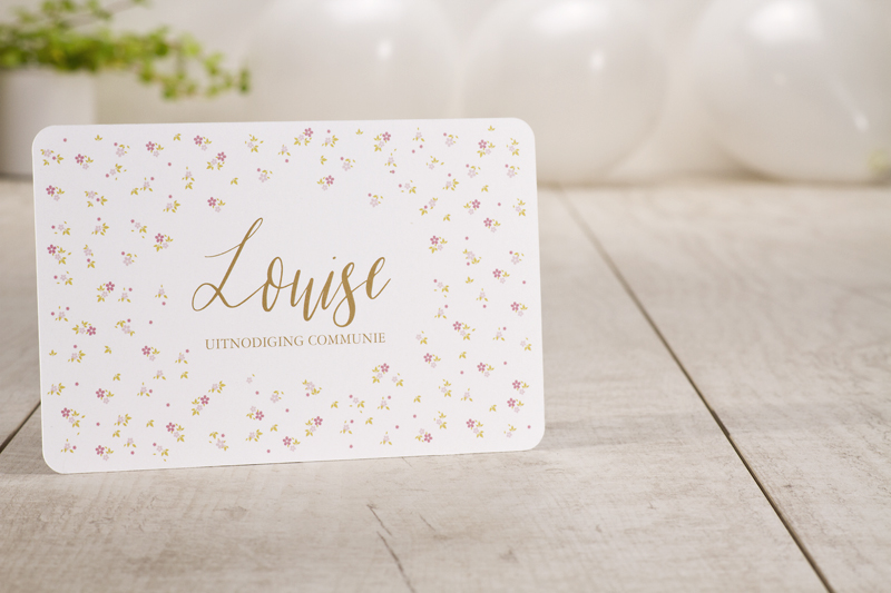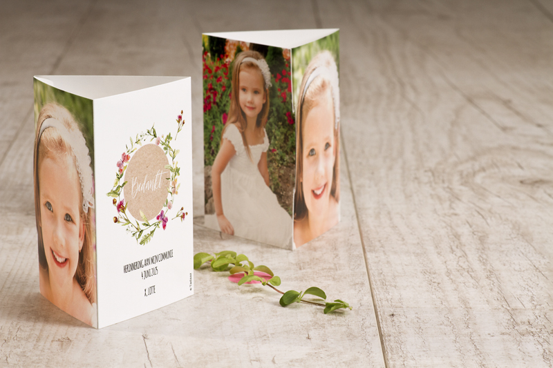 Een mooie bloemenkrans of fijne bloemetjes vormen het perfecte motief voor een girly communiekaartje. Combineer dit motief met een sierlijk lettertype en een prachtige foto en het vormt een perfect geheel!