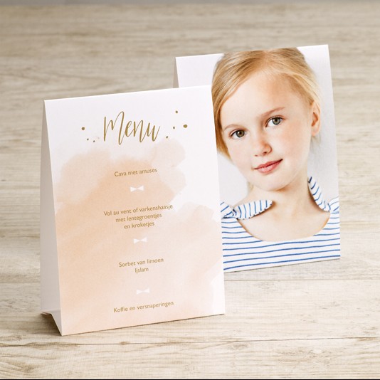 Een mooie feesttafel werk je zelf af in de tinten met placemats en menukaartjes met aquarel motief. De naam van jullie zoon of dochter staat ook hier centraal, want dat is toch het middelpunt van de belangstelling op zo’n mooie dag?