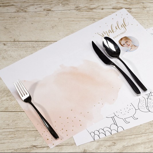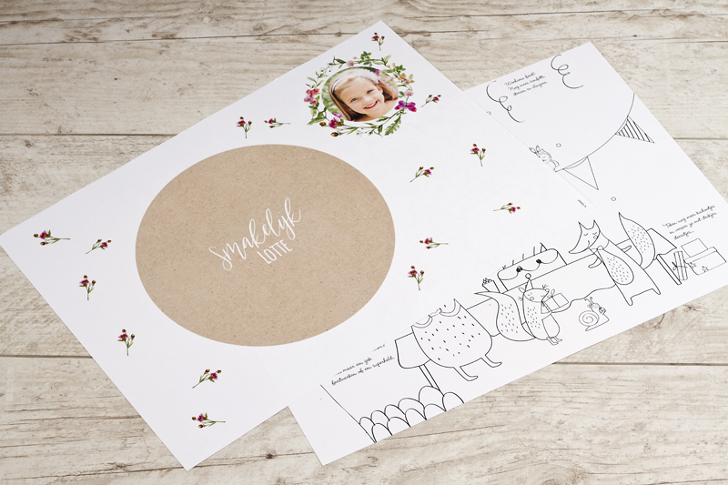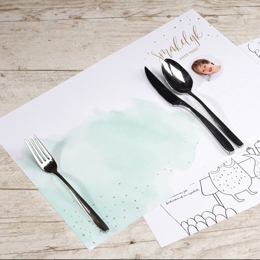 Kies ook in de tafeldecoratie voor een gepersonaliseerde afwerking. Een placemat, menukaart, servetring… met de foto en of de naam van jullie feestbeest maak je in 1-2-3 online.