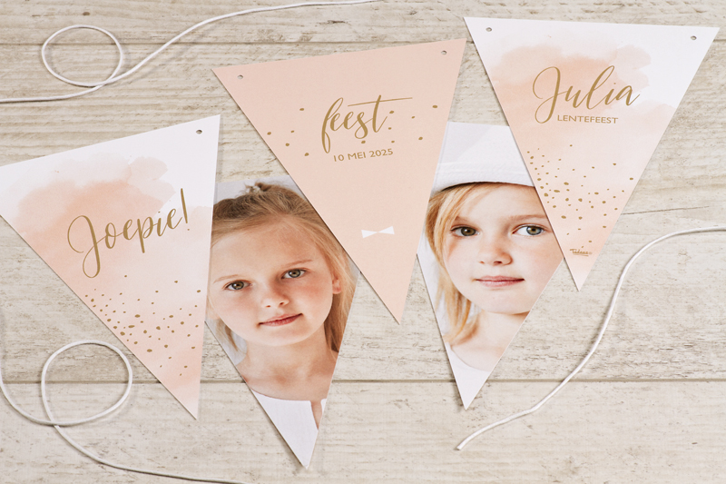Een feestzaal zonder vlaggenlijn, dat kan je je toch niet voorstellen? Een toffe vlaggenlijn met eigen foto’s is meteen een eyecatcher in de feestzaal en zorgt voor een feestelijk effect! Maak je eigen vlaggenlijn online en plaatst er de leukste foto’s en de naam van het feestbeest op.