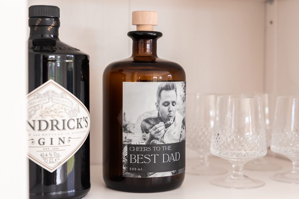 Vul deze glazen apothekersfles met gepersonaliseerde sticker met het favoriete drankje van je papa en verras hem met een heerlijk aperitief of digestief. Dit cadeau is volledig op maat van jouw papa. Personaliseer de fles met een foto van jullie samen of van zijn kleinkinderen en met zijn naam of een leuke quote en vul de fles met 700ml drank naar keuze. Volledig gepersonaliseerd dus!