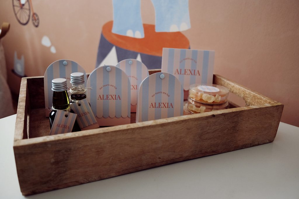 Voor de geboortekaartjes en doopsuiker koos Elien voor de typische circusstreepjes die de vrolijke sfeer van de circustent perfect weerspiegelen. Een prachtig totaalconcept!